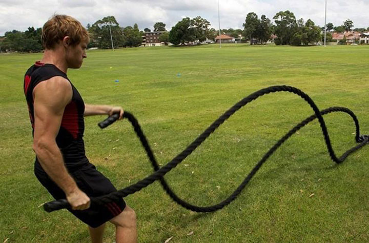 說明:粗繩抖動(dòng)訓(xùn)練是較高水準(zhǔn)體能訓(xùn)練中的必備項(xiàng)目,它在抖動(dòng)的過程中由于方向節(jié)奏,方式和波形的不同,促使全身各個(gè)部分的體能都要做出強(qiáng)烈的反應(yīng)。